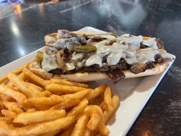 Shredded prime rib, onions, mushrooms and peppers topped with Swiss cheese